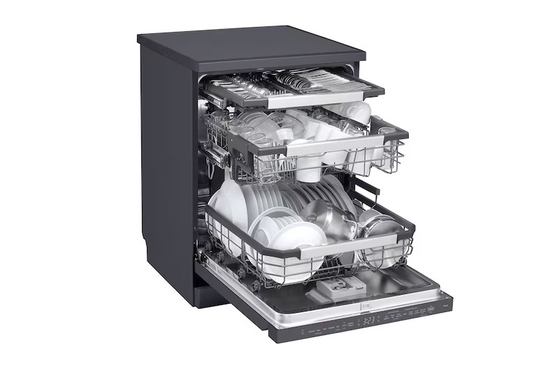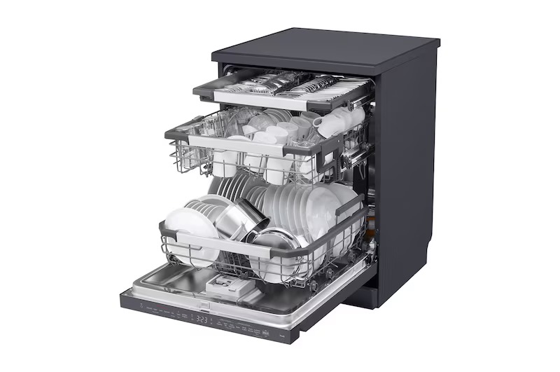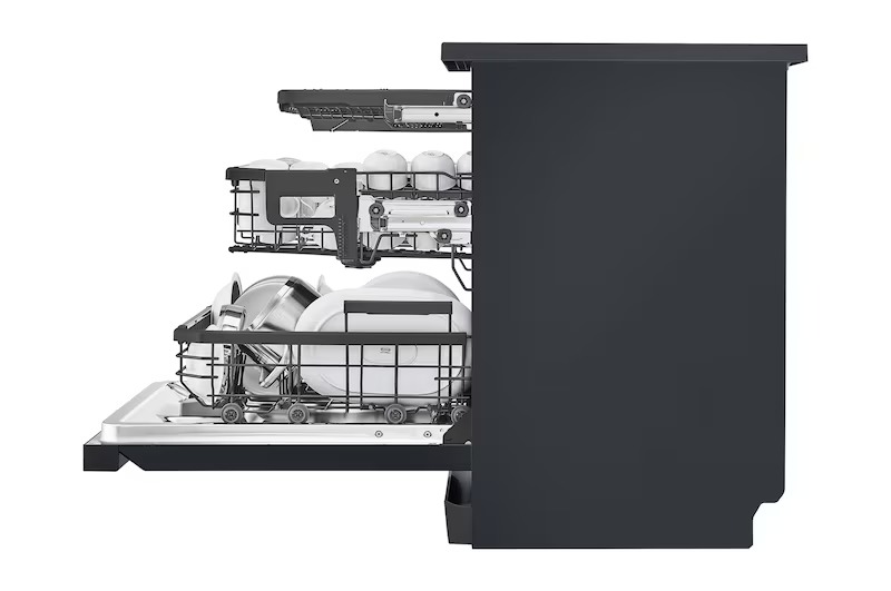 ظرفشویی ال جی 287 سری 2025 توی فضای داخلیش واقعاً فکر همه چیز رو کردن. سه تا سبد داره که هرکدومشون برای یه کار خاصی طراحی شدن. سبد بالایی که باریکه، مخصوص قاشق و چنگال و فنجونای کوچیکه. سبد وسطی واسه لیوانها و بشقابهای متوسط عالیه. سبد پایینی هم که بزرگترشونه، جای قابلمهها و ظرفهای بزرگ. حالا اینجا قضیه جالب میشه - با قابلیت EasyRack Plus میتونی سبد وسطی رو مثل آسانسور بالا ببری و فضای بیشتری واسه ظرفای بزرگ درست کنی. مثلاً بعد از یه مهمونی که کلی دیس و کاسه بزرگ داری، خیلی به دردت میخوره. سبد بالایی هم ارتفاعش تنظیم میشه و میلههای نگهدارنده ظروف هم میشه جابجاشون کرد. یعنی واقعاً هر جور دلت بخواد میتونی چیدمان کنی.