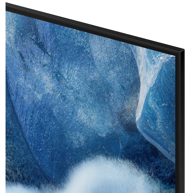 قابهای این دستگاه بسیار باریک طراحی شدهاند که در واقع نامحسوس می باشند. طراحی 3 Bezel-less یعنی سه طرف تلویزیون حاشیههای بسیار نازکی دارند و فقط قاب پایین تلویزیون ضخیمتر است. این طراحی باعث میشود تصویر انگار در هوا معلق باشد و تمرکز بیننده کاملاً روی محتوا قرار بگیرد.